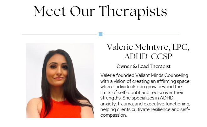 At Valiant Minds Counseling, our therapists share a common mission: to provide compassionate, evidence-based care that honors your unique story. We believe that therapy is more than problem-solving; it’s about rediscovering strength, nurturing self-understanding, and creating meaningful change that lasts.